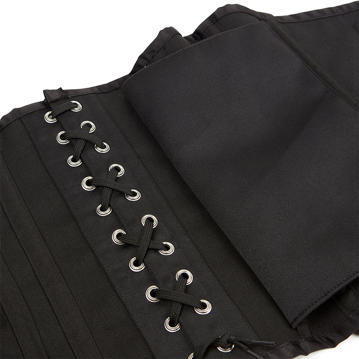 This Gothic Underbust Corset features pure black fabric, built-in 12 steel bones for extra support, the two edges of the top are higher than middle which help to absorb mamma accessoria but not hurt your lower chest. Front classical busk closure, back lacing for cinching.