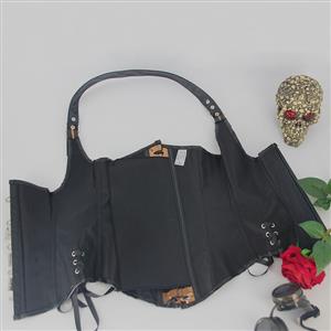 This Steampunk Underbust Corset featuring high quality PU leather, adjustable halter strap, front busk and 4 buckle closure, side lace-up detailing, 10 plastic bones for shaping, lace-up back for cinching.