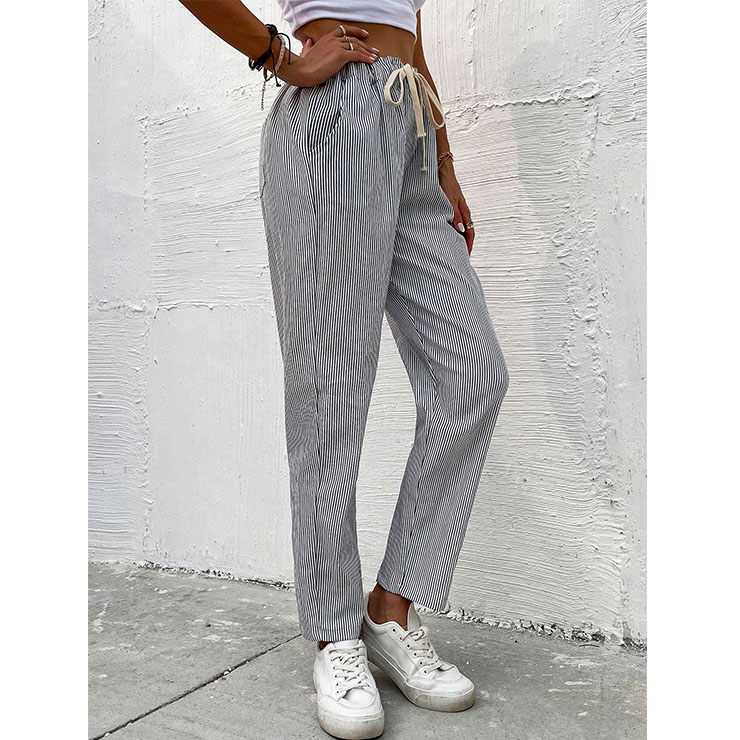 This fashion trousers featuring high quality and soft fabric, fashion pinstripe covering, high waist with an adjustable band, cozy straight-leg design, lovely white floral linning which is fashionable to roll up the leg openings.