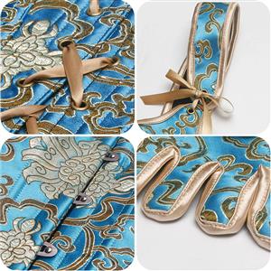 This Gothic Overbust Corset featuring exquisite brocade, wide shoulder straps with adjustable ribbon, golden trim detailing, unique design wavy hemline, 14 steel bones for shaping, front busk closure, lace-up back for cinching.