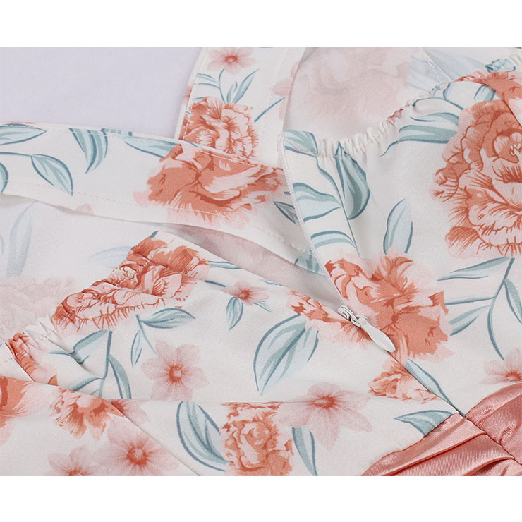 This vintage dress featuring beautiful retro floral pattern, sexy satin halter neck, unique design surplice create a sweetheart bodice, high waistline, charming A-line swing silhouette, elastic band and concealed zipper closure at back.