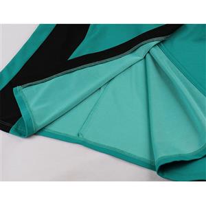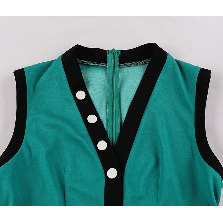 This sexy dress featuring unique design green dress with black trims contrast color at neck, cuffs, waist and skirt. Sexy V neckline and sleeveless, buttons detailing, high waisted and figure-hugging, side split design and midi length design make you look more sexy and beautiful, back concealed zipper closure.
