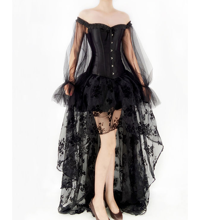 This Gothic Corset Dress features heart shaped bustline overbust corset with ruffled trim and bowknot detailing, off-shoulder and see-through mesh long sleeves, built-in 12 plastic bones for extra support, front busk closure for easy wearing, back lacing for cinching.