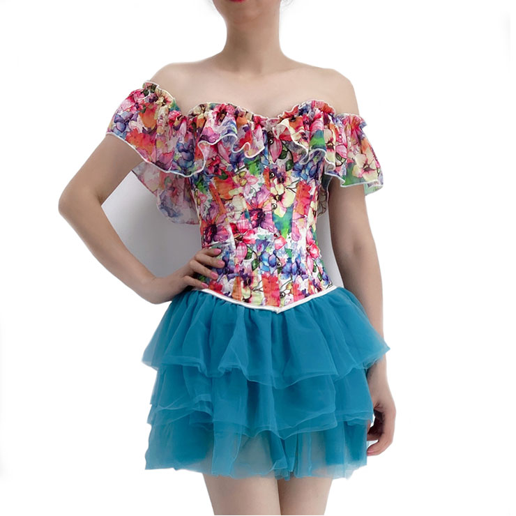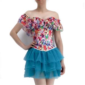 This Retro Overbust Corset Skirt features: beautiful floral print corset with heavy pleated and ruffles around the heart shape bodice, 12 plastic bones for shaping, front busk closure, lace-up back for cinching.