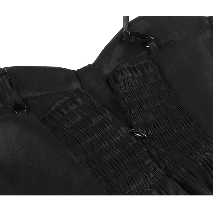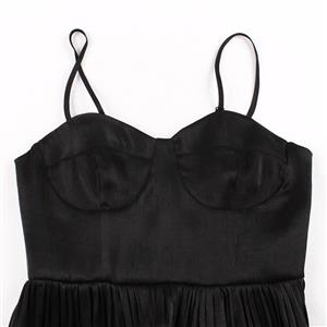 This women's sexy dress features: sexy padded cup bustier with adjustable spaghetti straps, elastic bands and zipper closure at back, attached glossy draped silhouette maxi skirt.