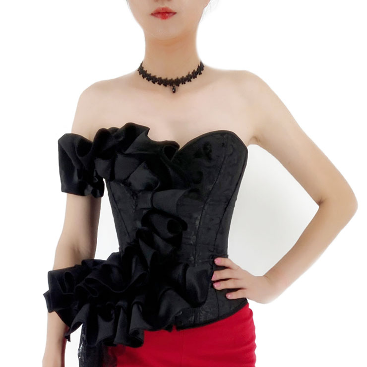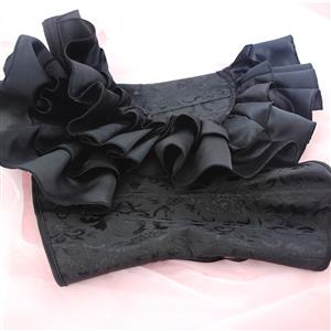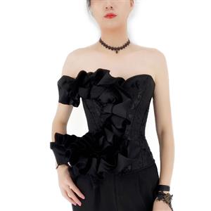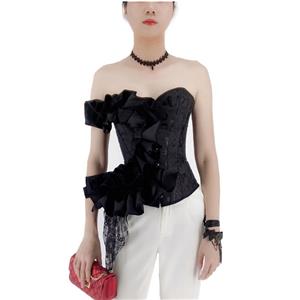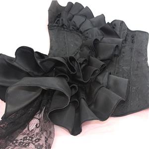 This black Sexy Gothic Overbust Corset features: beautiful jacquard with delicate black floral lace covers the corset, sexy off-shoulder strapless heart shape bodice with wedding satin, 12 plastic boned for shaping, front durable steel busk closure for easy wearing, back lacing for cinching.