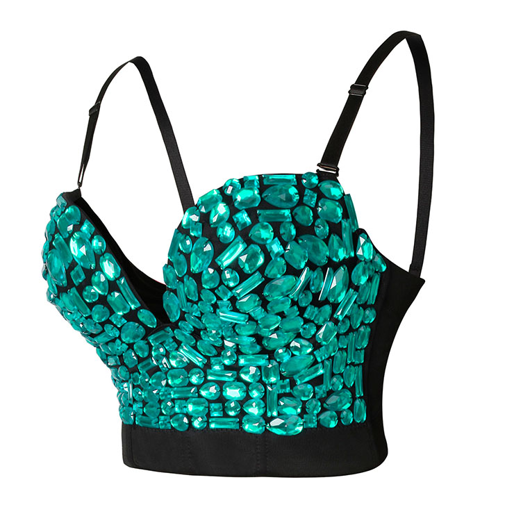 This sexy clubwear bra featuring crop top design,green sweets studded gem covered,back is black,adjustable and detachable spaghetti straps, 4 rows of hook and eye closure back. Perfect for clubbing, night out dancing, party, cosplay, halloween, bar, gathering, daily casual and so on.