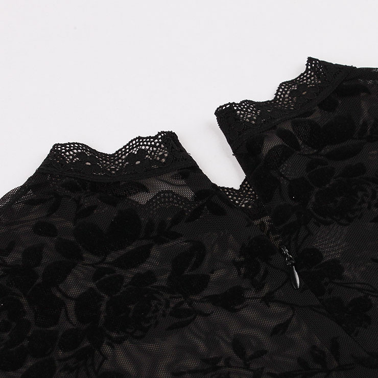 This women's sexy blue retro dress features: flying sleeve and half-high collar, see-through black floral, stitching heart shape bust, A-line style, high waist and swing hemline design, zipper at the back. Perfect for Halloween, daily casual, cocktail,dating, outdoor, party and other occasions.