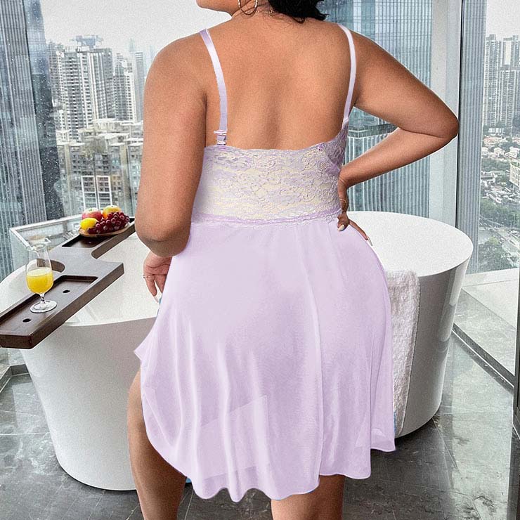 his plus size purple charming babydoll lingerie featuring made of soft and comfortable lace and mesh fabric, super low bra and backless design, mini length, spaghetti straps and see-through make you more stimulate and exciting. Matching sexy thong. Suitable for bar, night club, daily collocation, Valentine's Day and more.