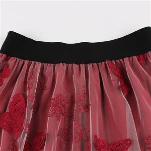 This wine-red Victorian Gothic A-line skirt features thin and soft fabric, double layered design, red butterfly pattern organza outer, high waist with elastic band, ruffle hemline make you look more elegant. Perfect for daily casual, ball, party, banquet and other special occasions.