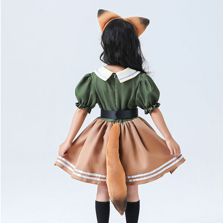 This girl lovely Nick Wilde police fox children cosplay costume features a short sleeve turndown collar dress, zipper in back. Matching fox head decorated, tie, fox tail, leathere belt. Suitable daily wear, Halloween and other occasions.