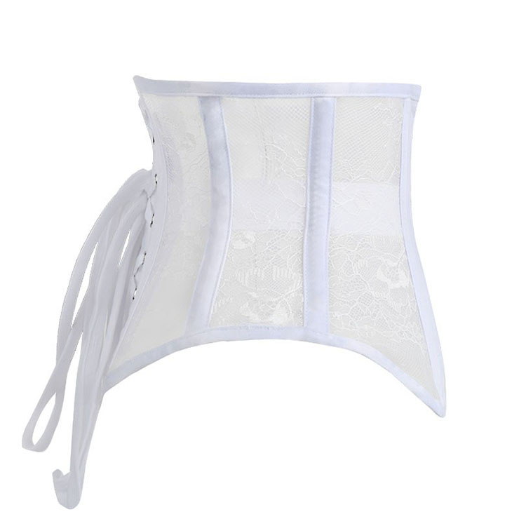 This white sexy like an hourglass Underbust Corset features see-through lace net cloth fabric, built-in 8 steel bones for flattening tummy, front 4 durable steel busk closure, back lace-up for cinching, show your more slim body.
