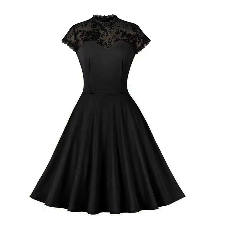 This women's sexy black retro dress features: flying sleeve and half-high collar see-through black floral, stitching heart shape bust, A-line style, high waist and swing hemline design, zipper at the back. Perfect for Halloween, daily casual, cocktail,dating, outdoor, party and other occasions.