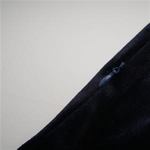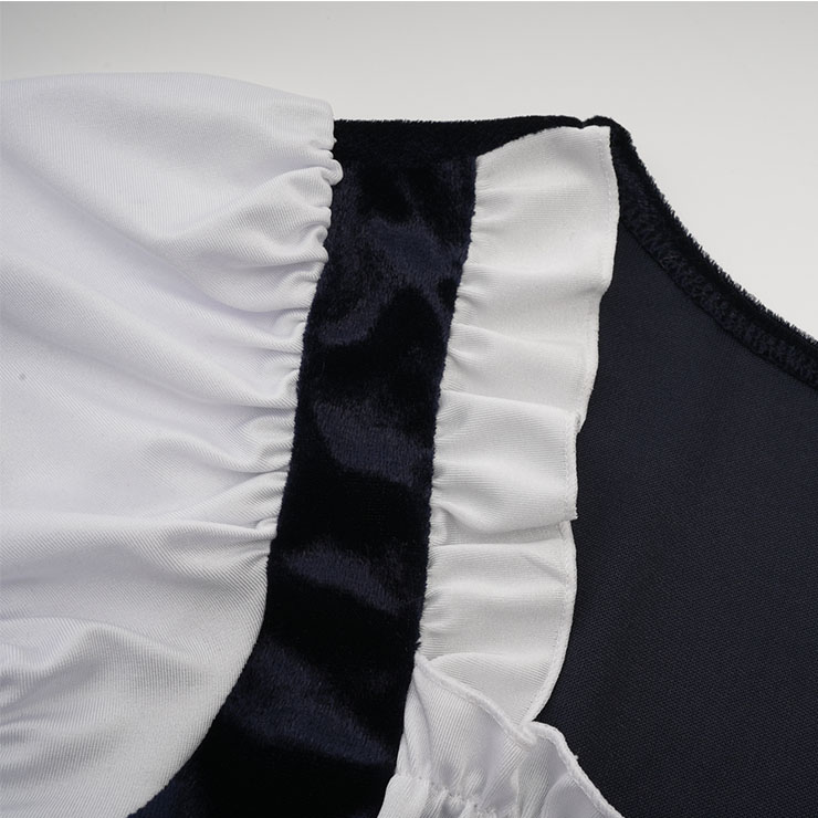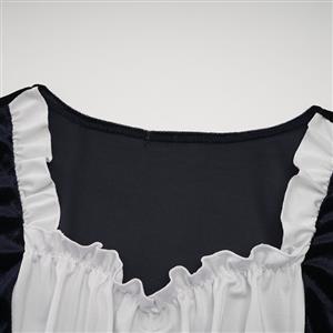 Women's adult maid cosplay costume featuring, a short sleeve blue and white dress, elastic ruffled and lace hem design, a white lace-up detailing at front, plaid covers the lower body dress, the zipper is hidden on the right side.