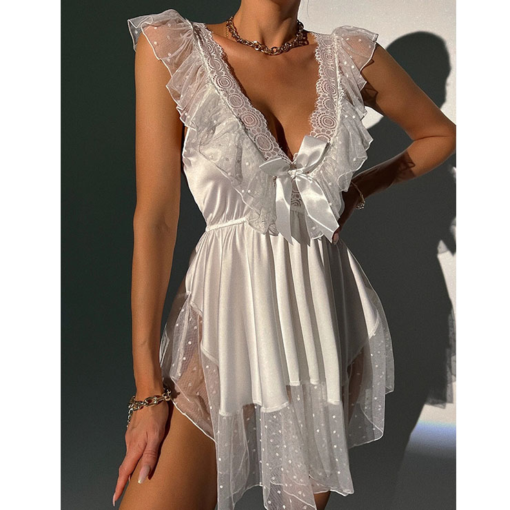 Sexy white fancy V neck mini dress lingerie characteristic: make of soft and comfortable lace material, see-through and mini length let you more lure and exciting. Lace, bowknot and irregular hem design more dream. Suitable for Bar, Nightclub, party, daily threads and other occasions.