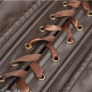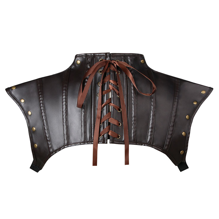 This brown steampunk shrug is characterized by high neck and adjustable buckles at front, cap sleeves and golden rivets embellished, plastic bones for support, lace-up back. A wonderful addition for steampunk costume and Gothic style.
