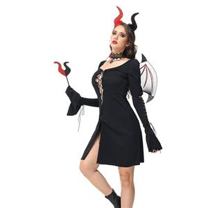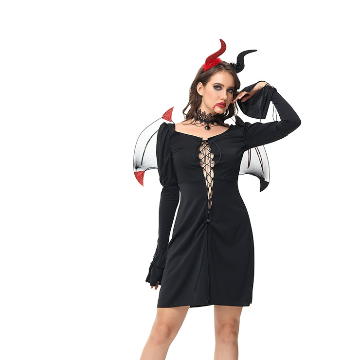 This black sexy Devil costume features: a black hollow out long sleeve dress, front lace-up easy to wear. Matching necklace. Suitable for Halloween, Masquerade, Cosplay, Performance and Other Special Occasions.
