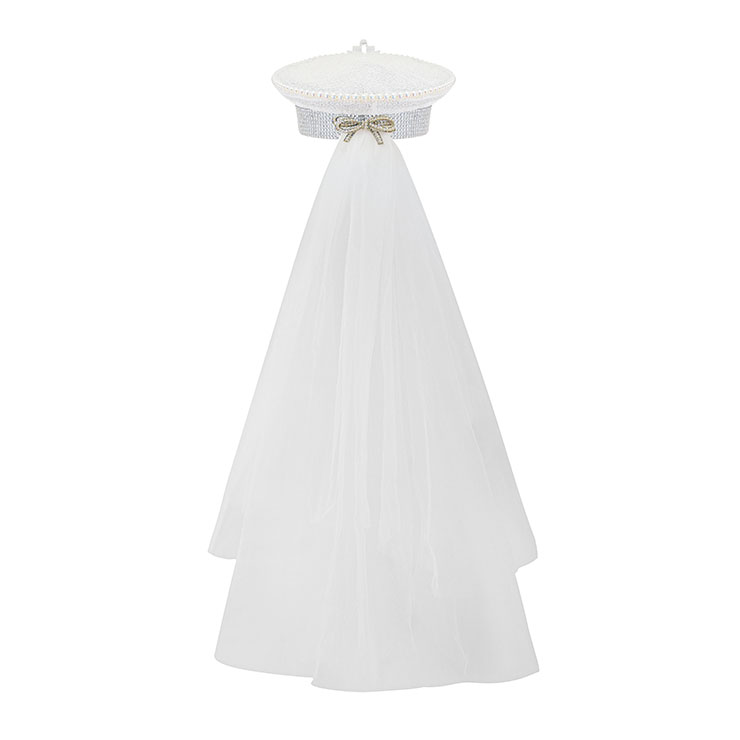 This is a fashion and steampunk hat set for events and festivals! Full of white sequins and small rhinestones around the hat, colorful artificial gemstones embellished, so fancy and eye-catching! Matching pearl English letters composed of BRIDE. Matching a white tulle bride veil. Perfect for cosplay, Halloween, masquerade party, Burning Man and more!