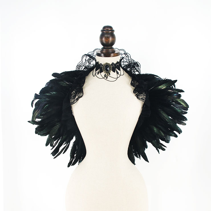 2pcs. This fashion Victorian Gothic shawl made of high quality feather, some lace design, front and back hollow out, back lace-up can flexible size adjustment. Matching distinctive chain necklace. Suitable for cosplay, Halloween, Drama and other occasions.