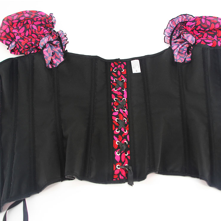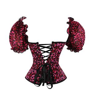 This Retro Overbust Corset features sexy and hot red lip pattern covers the whole corset, heart shaped bustline, elastic puff sleeves with ruffles, built-in 12 plastic boned for extra support, front 6 durable steel busk closure for easy wearing, back lacing for cinching.