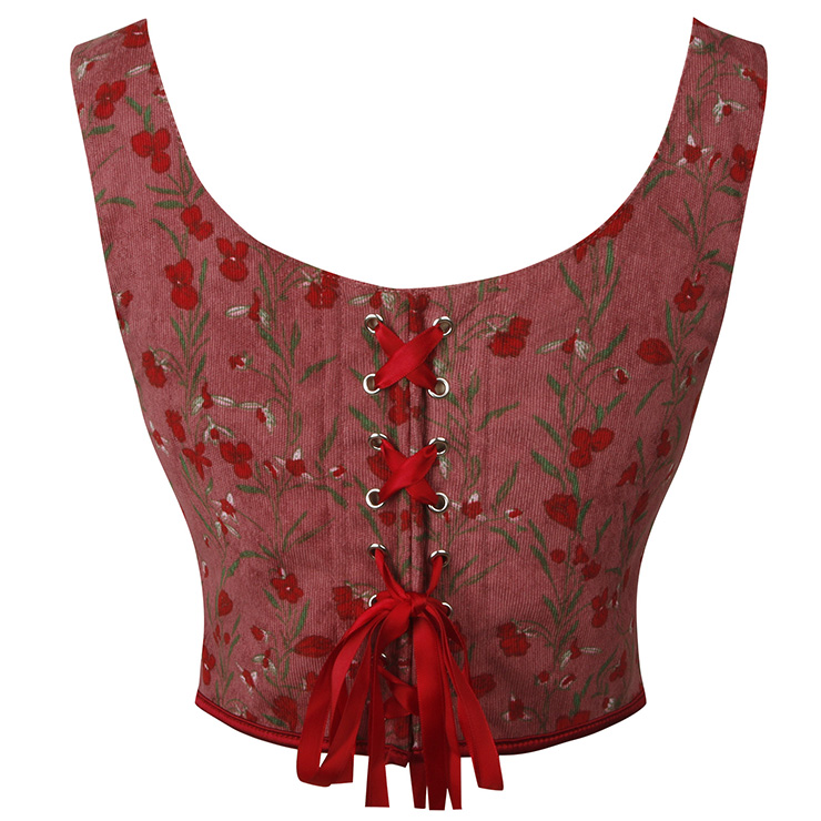 This Renaissance floral corset has a red bow on the chest, shoulder strap design, and zippers on the side. It is very suitable for parties, Renaissance events, Christmas, and other events.