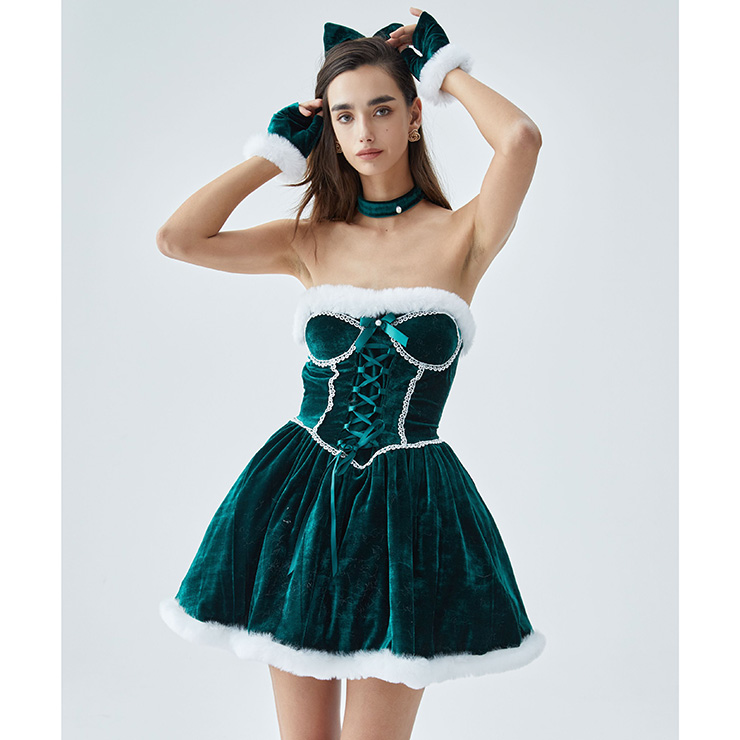 This vibrant red velvet Christmas set features a corset-style dress with lace-up detail and white fur trim. The matching cat ear headband and fingerless gloves complete the playful holiday look. Perfect for Christmas parties and festive photos.