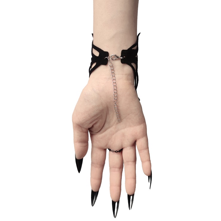 Embrace dark elegance with our Gothic spiderweb hand chain, featuring an intricately woven black web design centered with a 3D spider charm. This adjustable piece connects a wrist cuff to a mid-finger ring via a delicate chain, creating a dramatic silhouette perfect for Halloween, cosplay, or Gothic-themed parties. Crafted from lightweight, skin-friendly materials, it offers comfort for extended wear while making a bold statement. Pair it with dark nail art to complete your mystical look.