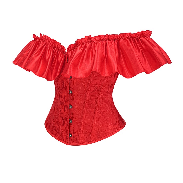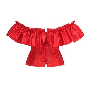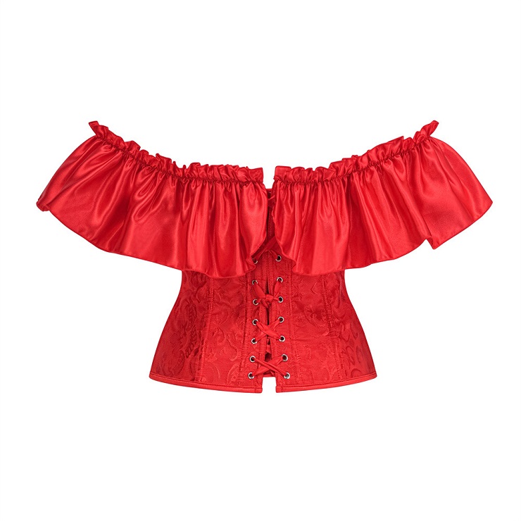 Embrace bold elegance in this striking red corset top. The dramatic off-shoulder design features wide ruffled sleeves that create a feminine silhouette, while the adjustable front lacing with metal grommets allows for a perfect custom fit. Crafted from premium satin fabric with subtle jacquard patterns, this bustier combines vintage inspiration with modern allure. Ideal for date nights, themed parties, or photoshoots that demand attention.