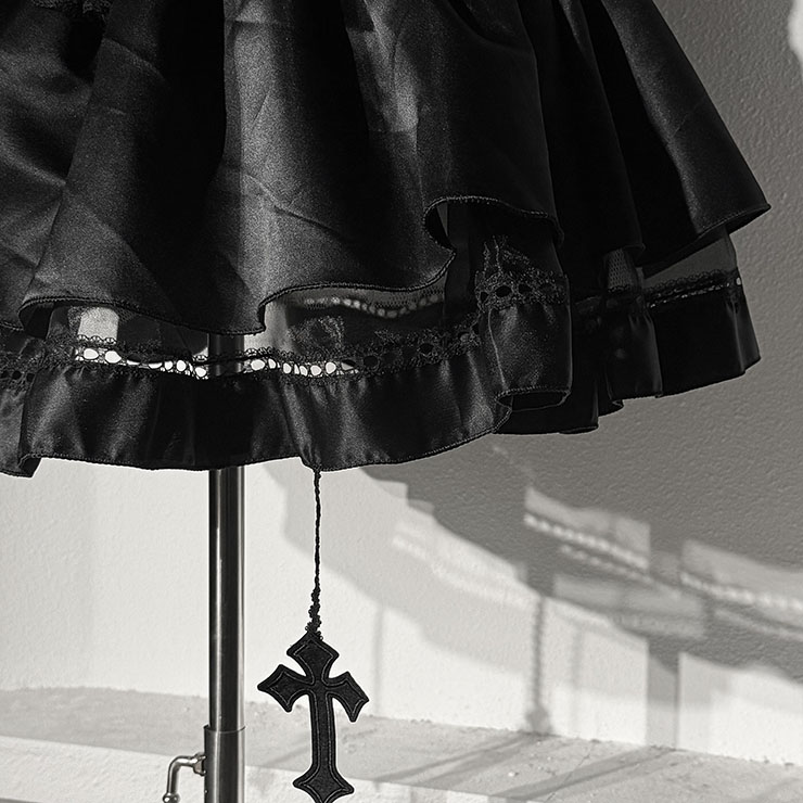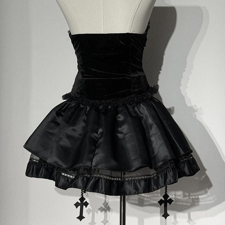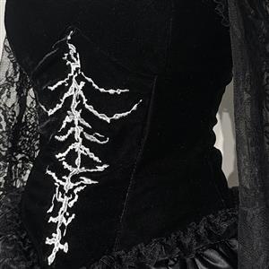 This gothic-inspired costume set features a form-fitting black bustier top with eye-catching silver skeleton embroidery, paired with a matching ruffled short skirt. The strong backlight highlights the dramatic silhouette against a dark, castle-like background, creating a bold and mysterious royal aesthetic. Perfect for gothic-themed events, Halloween, or dramatic photoshoots.