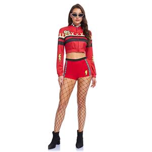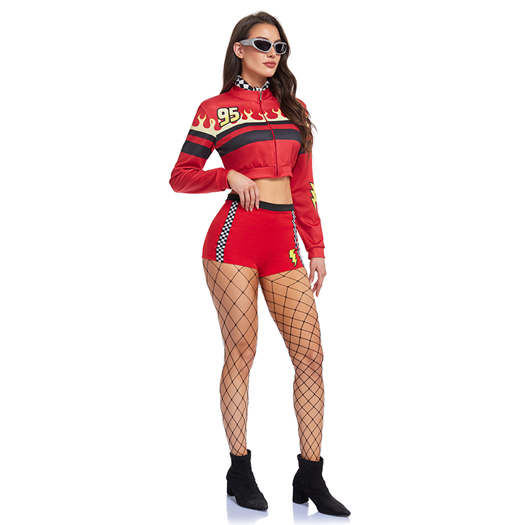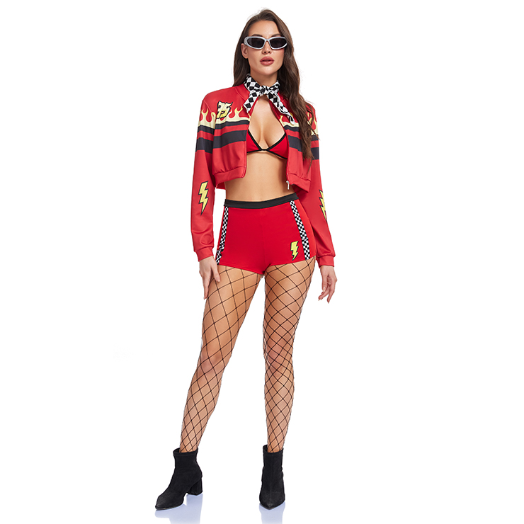 This bold red race girl costume set includes five key pieces: a cropped jacket with lightning and flame prints, a red inner top, matching shorts with checkered side stripes, a checkered neck scarf, and sleek sunglasses. Paired with fishnet stockings and ankle boots, the set creates a vibrant, high-energy look perfect for racing events, cosplay, or themed parties.
