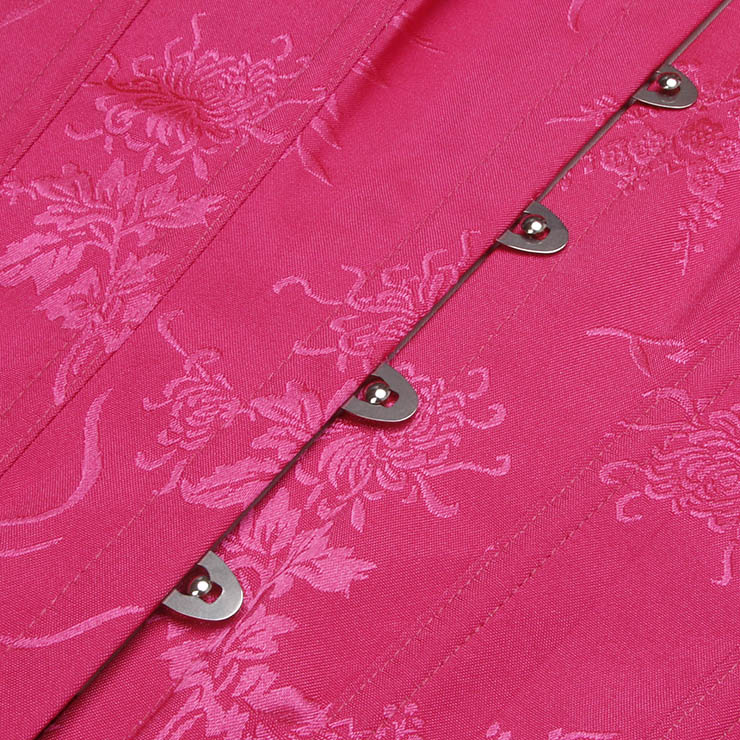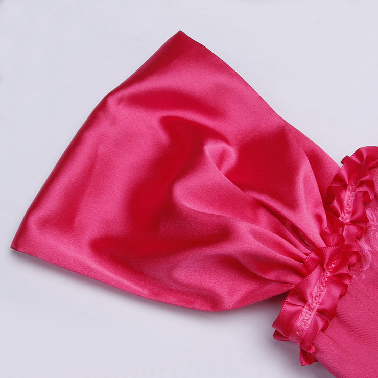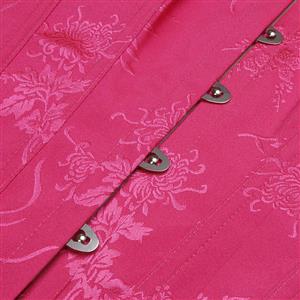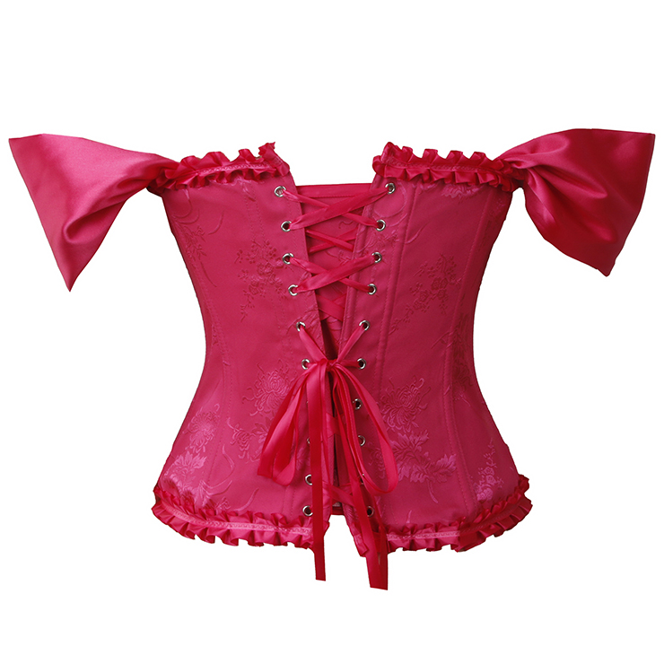 This Gothic overbust corset attached 10 plastic bones, made of beautiful brocade, unique wide shoulder straps design, ribbon bowknot detailing, front busk closure, lace-up back for waist cinching,