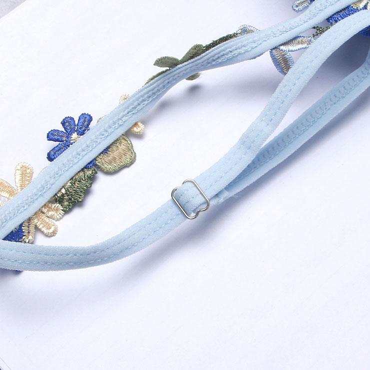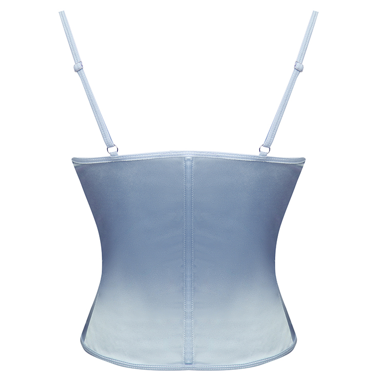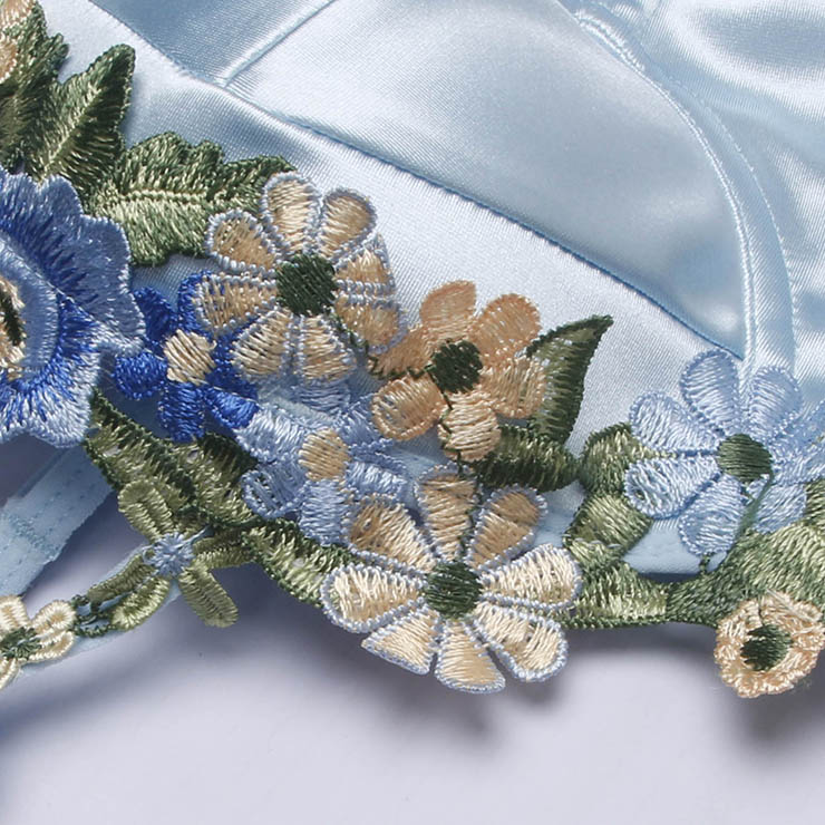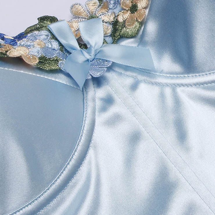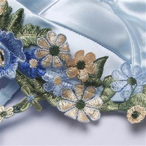 Crafted from lustrous sapphire blue satin, this corset features delicate floral embroidery at the neckline with blooming hues of lilac, white and seafoam green. The adjustable thin straps with metal sliders ensure a perfect fit, while the elegant back seam enhances posture and silhouette shaping. Ideal for bridal lingerie, photoshoots, or special occasions, its stretchable fabric offers both comfort and a figure-flattering effect