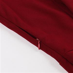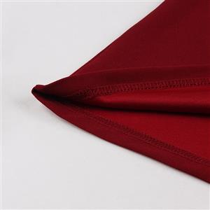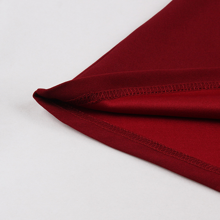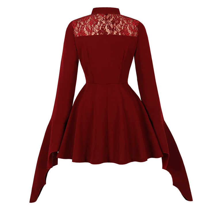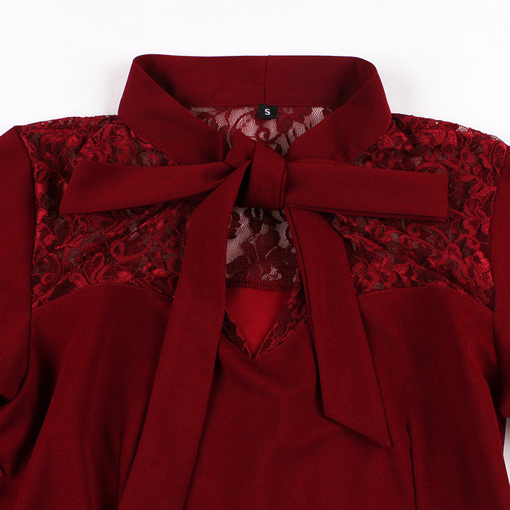 This elegant burgundy Gothic dress blends dark romance with sweet details. The front features a sweetheart neckline accented by a delicate lace panel across the chest, while the back offers a stunning lace-paneled open design. Dramatic batwing sleeves flow into flared cuffs, adding movement and mystery. A large satin bow adorns the neckline, complemented by a fitted waist and soft A-line skirt for a flattering silhouette. Perfect for Halloween, themed parties, or an evening of dark elegance.