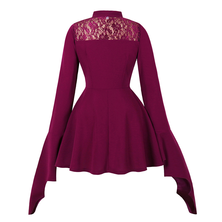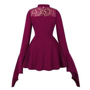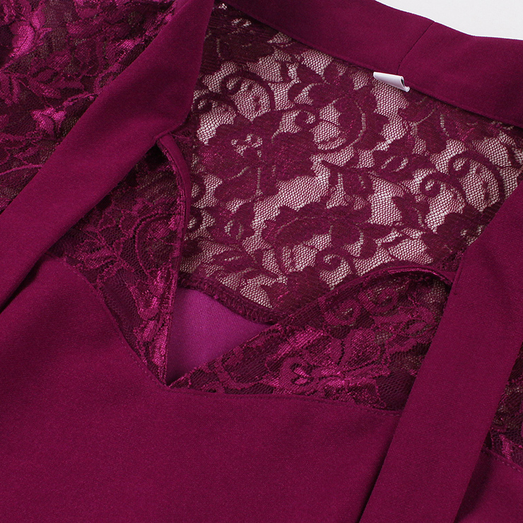 This elegant Gothic-style dress blends a dark, romantic purple hue with sweet, dramatic details. The front features a sweetheart neckline accented by a delicate lace panel across the bust and a large satin bow at the high collar. The back showcases an open lace panel design, adding a hint of allure. Flowing batwing sleeves with wide, flared cuffs create movement and a touch of mystery, while the fitted waist and soft A-line skirt ensure a flattering silhouette. Made from rich purple fabric with lace inserts, this dress is perfect for Halloween, themed parties, or evenings out with a Gothic twist.