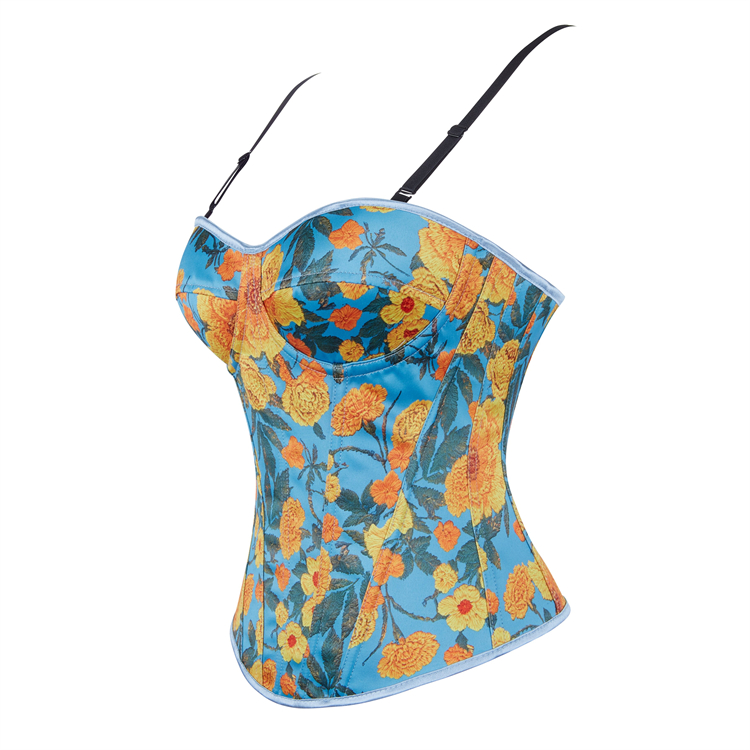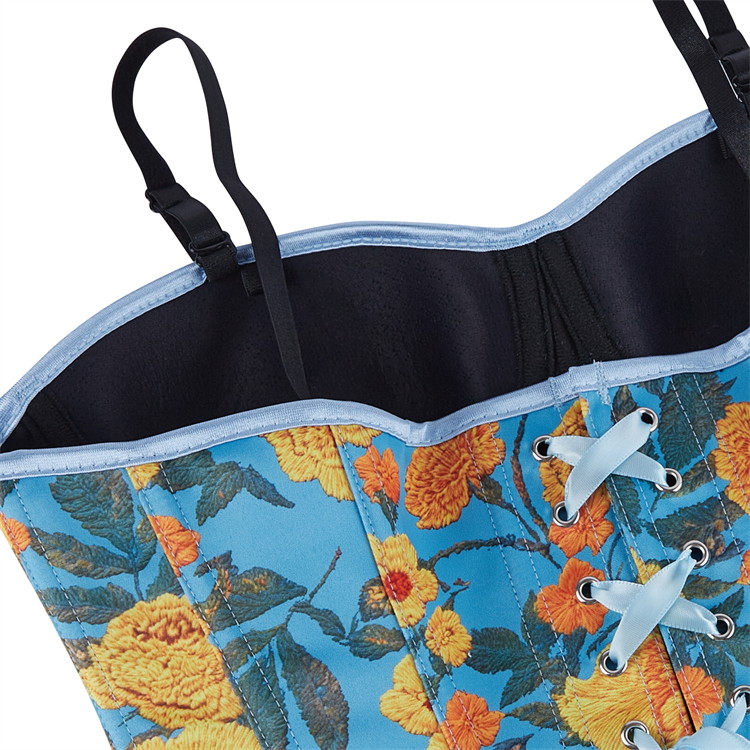 This vibrant blue floral corset top sculpts your silhouette with a sweetheart neckline and thin black straps. The adjustable back lace-up ensures a custom, waist-cinching fit, while the smoothing fabric gently shapes your curves. Perfect for layering or as a playful, retro statement piece.