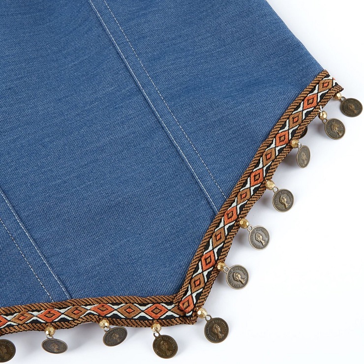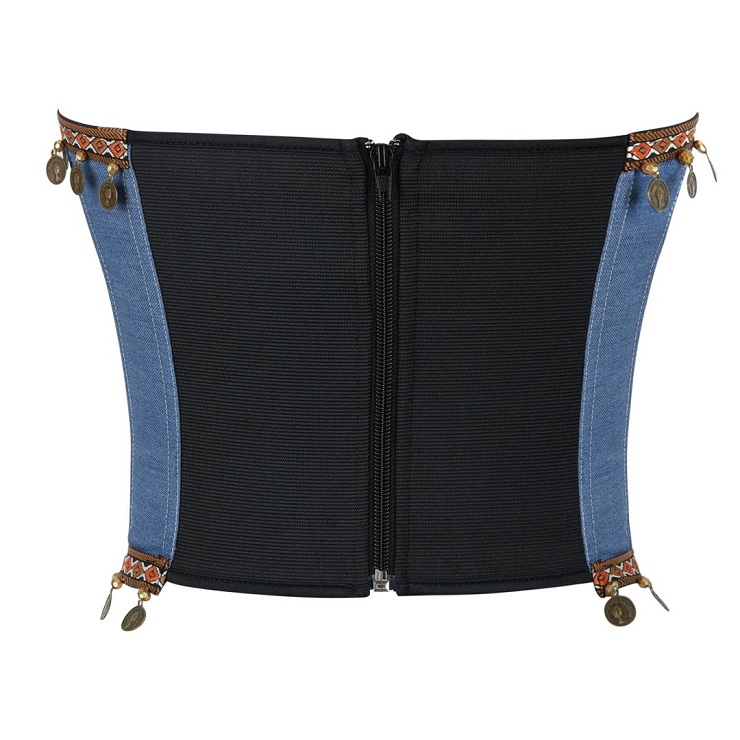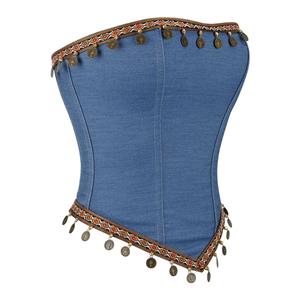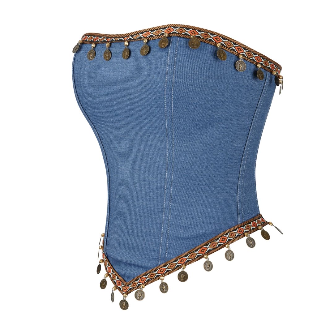 A fusion of bohemian spirit and classic shape, this strapless bustier is crafted from structured blue denim. Its front is accented with a bold geometric band and dangling antique coin embellishments, while the back features a comfortable black stretch panel with a center zipper. Designed for a sculpted fit, it’s perfect for festivals, parties, or adding a tribal-inspired statement to any layered look.