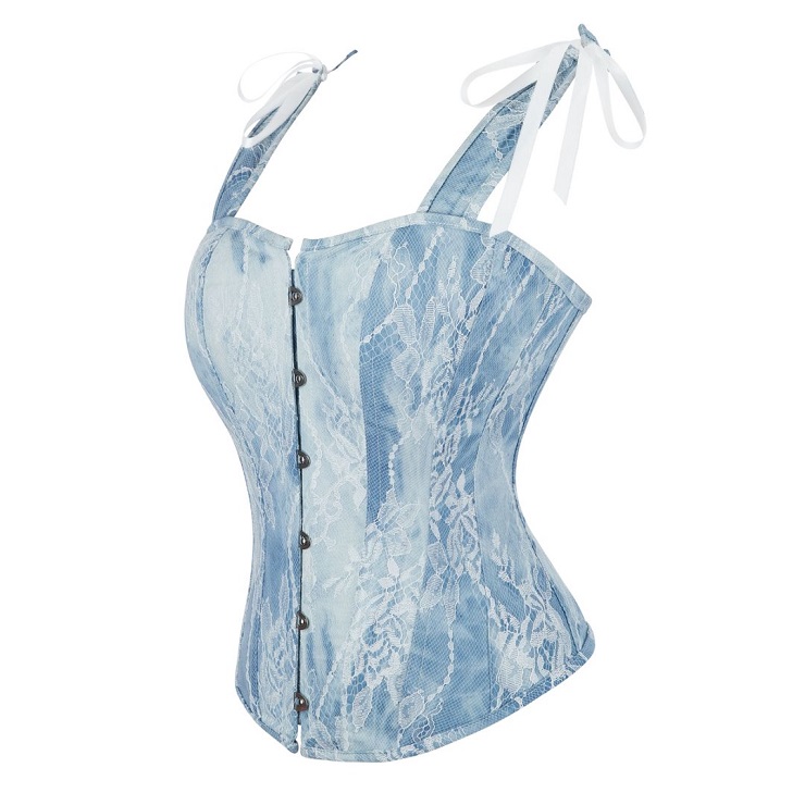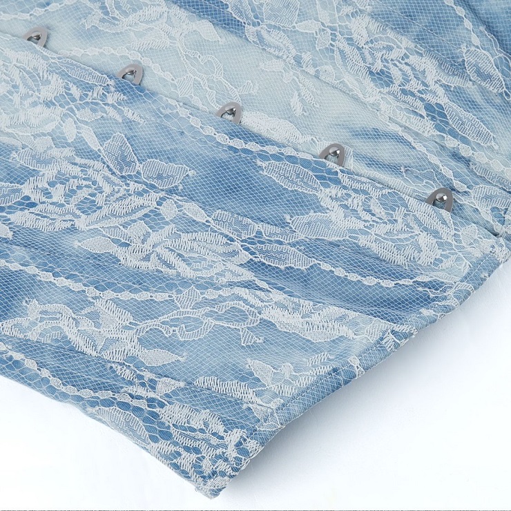 Crafted from delicate light blue lace with intricate floral patterns, this corset top blends vintage charm with everyday wear. The flattering square neckline and front snap closure offer style and ease, while the adjustable shoulder straps feature dainty white ribbon bows for a custom fit. It gently shapes your silhouette and is perfect for layering or as a romantic piece for dates and special occasions.