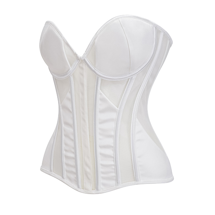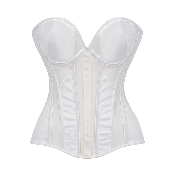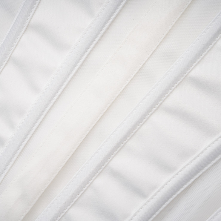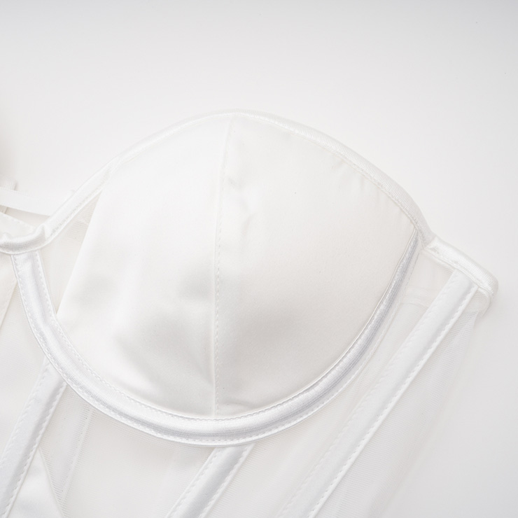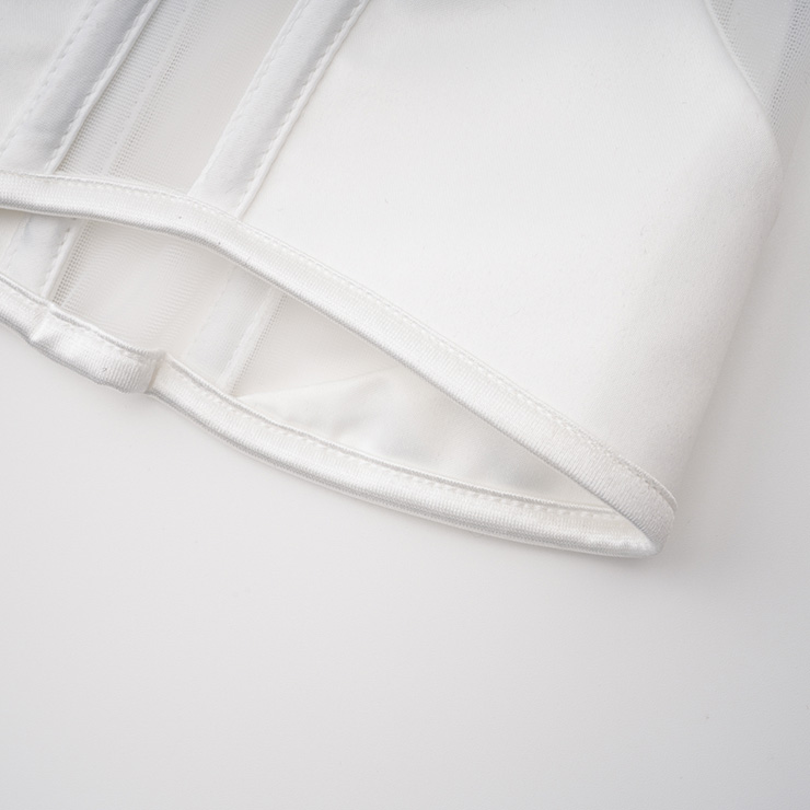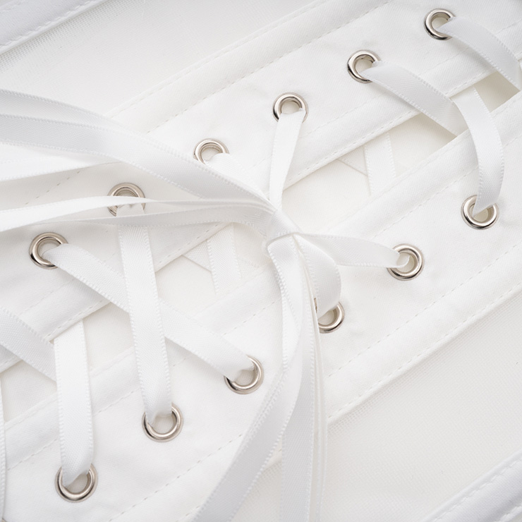 Crafted in smooth white fabric, this strapless bustier sculpts your waist for an elegant silhouette. It features a classic V-neckline and boned structure for support, with a back lace-up closure for a customizable, hourglass fit. Perfect as bridal shapewear or for special occasions.