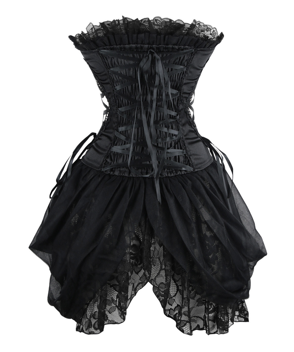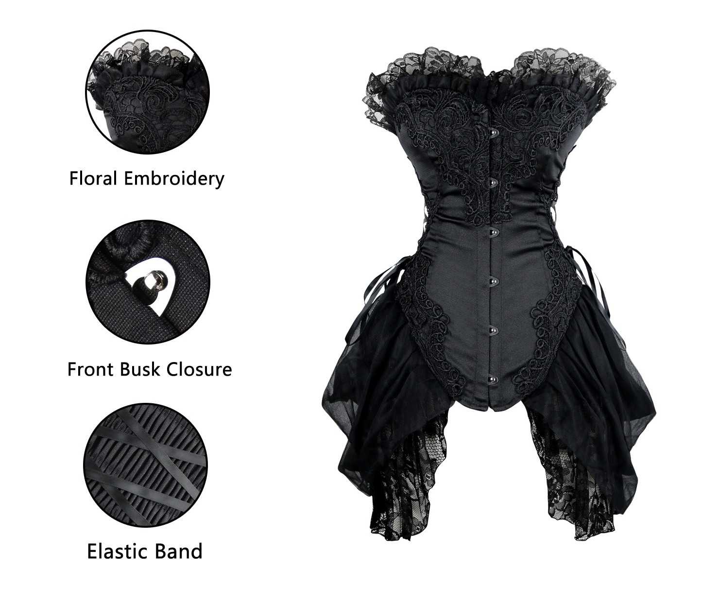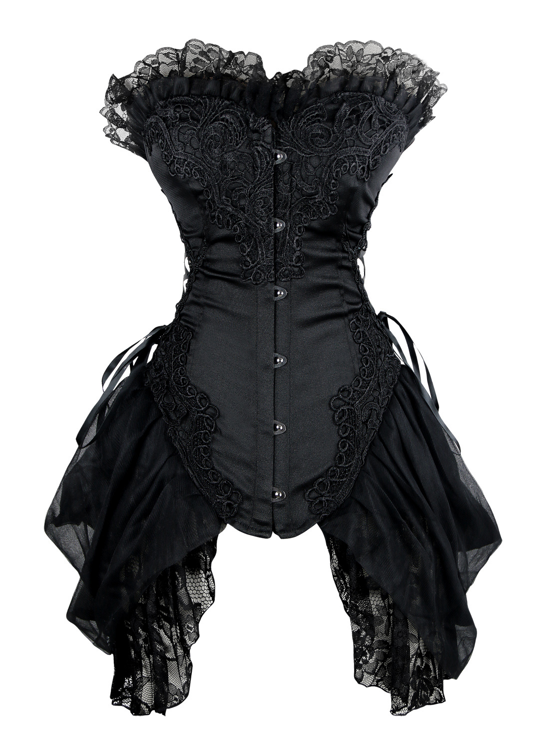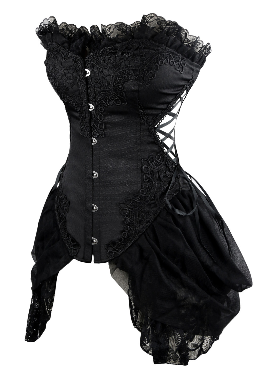1 Piece Suit, Burlesque Black Bustier Corset Made From Luxurious Material With Lace Trimmed, Side and black lace up. Front Buckle Closure, and attached lace side detail.